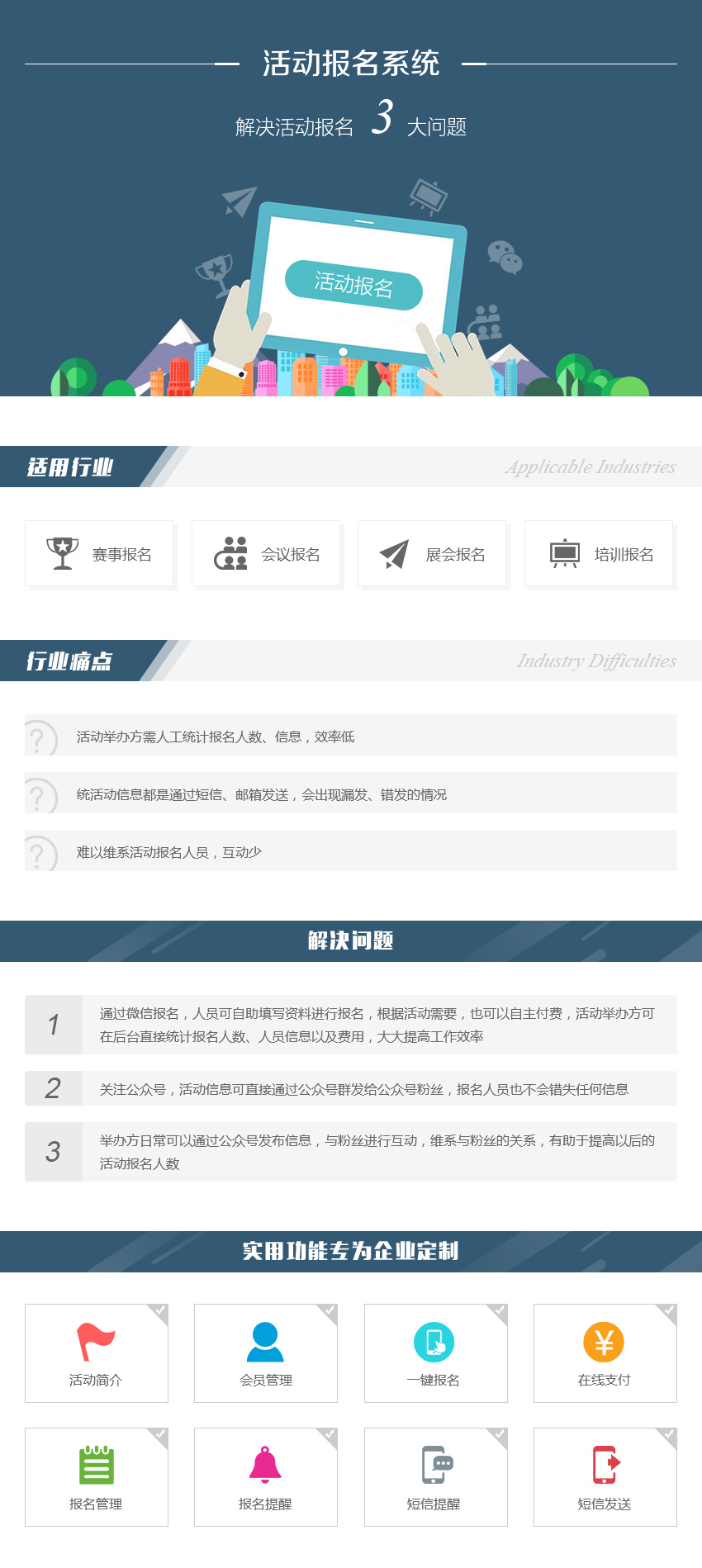 活动简介、会员管理、一键报名、在线支付、报名管理、报名提醒、短信提醒、短信发送